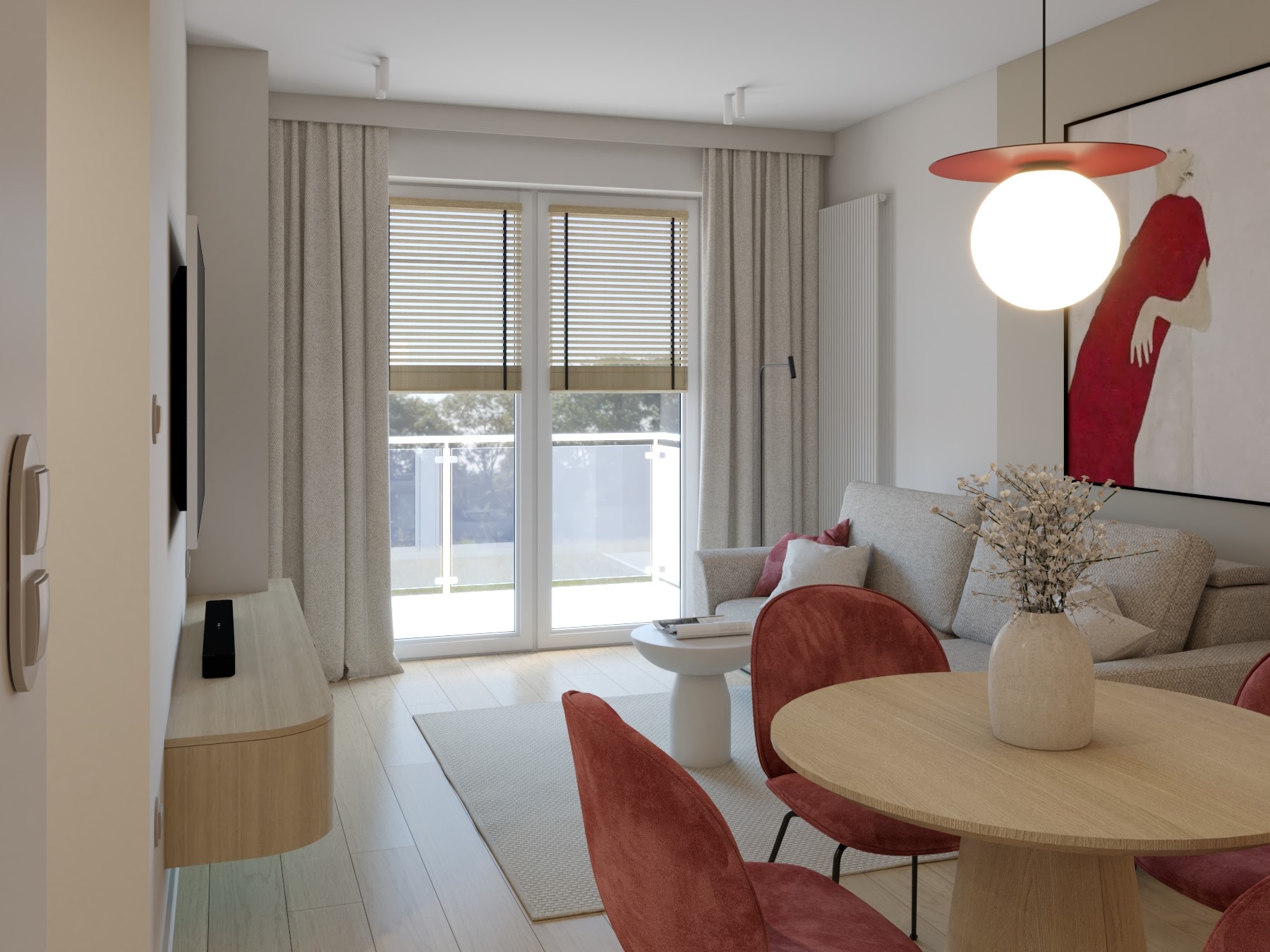 Piękne, komfortowe mieszkanie usytuowane na parterze kameralnego, dwupiętrowego budynku. Wschodnia ekspozycja zapewnia przyjemne, poranne nasłonecznienie, wypełniając wnętrza naturalnym światłem i tworząc świeżą, spokojną atmosferę na start dnia. Przestronny salon, duża sypialnia oraz pokój tworzą wygodną, harmonijną przestrzeń do życia i wypoczynku.